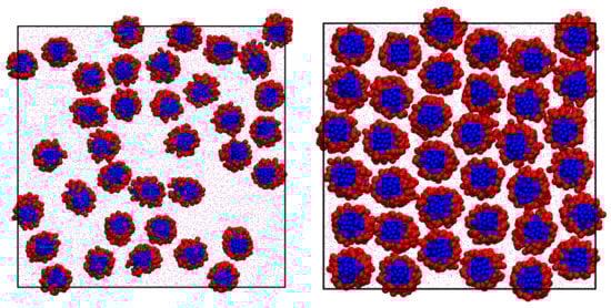 At the other end of the scale of models in Figure 8c is a dissipative particle dynamics (DPD) representation of TP6EO2M: A model was designed by Walker et al. []. For TP6EO2M, two things are critical: the balance of interactions between hydrophobic and hydrophilic beads and also relative to the DPD energy scale, i.e., that controls the magnitude of the reduced temperature . The former can be tuned for many DPD systems based on experimental infinite dilution activities or chemical potentials obtained from dilute atomistic simulations. For TP6EO2M, the latter is available from atomistic modelling (as discussed above).