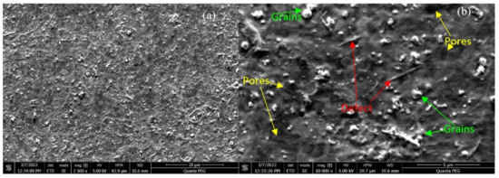 SEM image of the NiO film surfaces: (a) across 100 μm of the sample surface, (b) on a small area of the sample covering 20 μm.