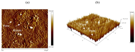 We also studied a 3 × 3 μm2 area across the sample surface using AFM microscopy to image the morphology of the synthesized NiO film. Figure 3a illustrates the 2D AFM images of the NiO sprayed films. A rough surface of the NiO film has been located similarly to that seen with SEM. Herein, a high-intensity region with grains like that revealed by SEM appeared clearly, with a good precision of their size and shape (see, Figure 3a). Additionally, weak intensity regions have been located where minor roughness could be reported assigned to the pores observed in SEM. Therefore, AFM measurements are consisting of SEM results. For better imaging, we represented this area using a 3D image (see, Figure 3b). This latest confirms the presence of grains and pores.