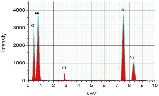 For a better analysis of the binary material ratio in the NiO prepared films. Nickel and oxygen stoichiometric ratios have been determined using EDX analysis (see, Figure 4). We located three main Ni peaks at around 1 keV, 7.5 keV, and 8.4 keV, respectively. Another peak has been observed at 0.5 keV which corresponds to oxygen. On the other hand, a fifth peak was also found near 2.8 keV. This latest could be originated from residual chloride descending from the protocol followed for the growth process. We also deduced the weight and atomic percentage of nickel and oxygen in the grown NiO thin films from EDX measurements. Table 4 summarizes the related mass and atomic percentages of the elements oxygen and nickel. We found an atomic ratio of [O]/[Ni] slightly higher than 1 (≈1.040) highlighting the p-type of the NiO material synthesized here.