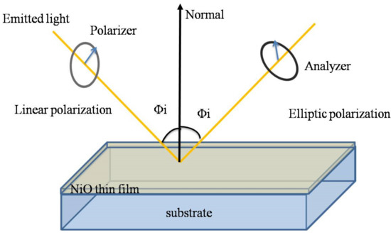 We studied the optical properties of NiO films with SE. A simplified diagram of the ellipsometry measuring device is given in Figure 5. This technique is a self-referencing technique, measuring the polarization states before and after reflection. It is based on the interaction of polarized light with a sample described by the Jones matrix formalism [73,74,75]:
