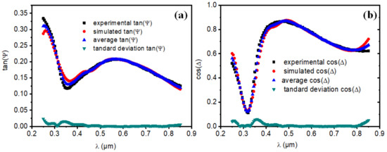 (a) Experimental, simulated, average experimental, and standard deviation plot of tan(Ψ), (b) Experimental, simulated, average experimental, and standard deviation plot of cos(Δ).