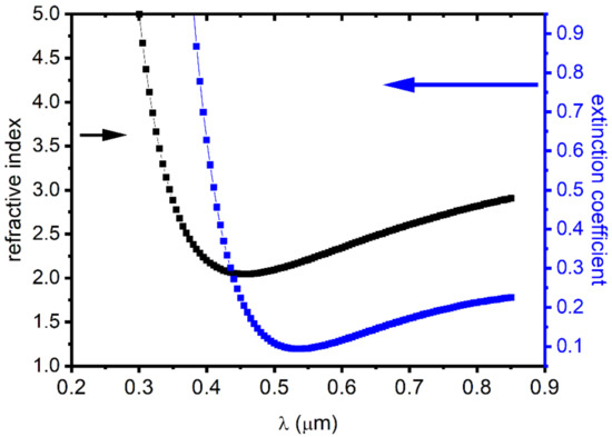 We could determine the dispersion parameter, i.e., the refractive index n(λ) and the extinction coefficient k(λ) using the obtained dielectric parameter. This is using the three following relations [76,79]: