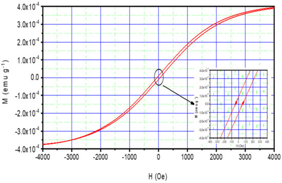 NiO materials display particular magnetic properties [80,81,82]. The saturation magnetization (Ms), the remanent magnetization (Mr), and the coercivity (Hc) of the NiO thin films have been studied using M-H hysteresis loops at room temperature (see, Figure 8). The associated values have been given in Table 5 after subtracting the magnetic contribution of the glass substrate from the overall magnetic behavior. The NiO films display a typical ferromagnetic behavior, despite the anti-ferromagnetic nature of the NiO material [83,84,85]. This unique magnetic effect found here could be related to the: non-stoichiometric defect. Indeed, the prepared thin films contain some defects such as stress and dislocations. This explains the structural defect and Weiss domains in the grown NiO thin films. Here, a minor interaction between domains may cause results that limit the polarization of the material with the coming magnetic field. This induces a ferromagnetic behavior of these films. On the other hand, nickel oxide as binary material is a p-type semiconductor [86]. This p-type has a non-stoichiometric defect that emerged due to the dual effect of chlorine and the excess oxygen. Indeed, the nickel chloride used during the synthesis process leads to a high density of defects due to chlorine that become pronounced when added to the local defect originated by oxygen forming NiO material. This stoichiometric defect may result in such a ferromagnetic behavior. Our find is consistent with previous studies. Indeed, a close ferromagnetic behavior has been reported for NiO powder at high and room temperature [87,88]. This confirms our results obtained for NiO thin film.