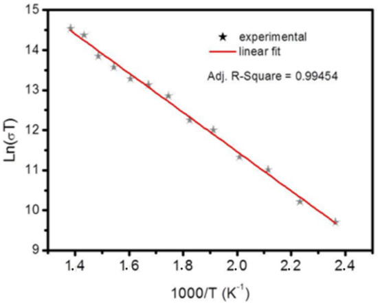 The electrical conductivity of the NiO films has been investigated via four points probe at different temperatures. The measurements at each temperature were performed after reaching the thermodynamic equilibrium (i.e., the stabilization of the temperature). The four probes have been arranged linearly, i.e., in a straight line equally distanced from each other. Herein, the potential drop V is measured across the middle of the two probes after the passage of a constant current through them. Meanwhile, the high-temperature effect on the sample has been considered after exposing it to an oven. Figure 9 illustrates the variation of Ln(σT) as a function of (1000/T). This image the electrical conductivity variation with temperature. The thermal conductivity exhibited a semiconductor behavior. Indeed, we found a linear decrease of Ln(σT) versus 1000/T, which confirms that the electrical conductivity follows the Arrhenius law [89,90,91]: