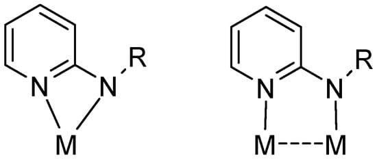 The coordination chemistry of 2-aminopyridines is a highly popular area of research mainly due to their easy accessibility as well as steric and electronic versatility [1,2]. The ligand class has shown rich coordination chemistry with predominantly chelating (common) and bridging coordination modes (Figure 1). In comparison, monodentate fashion of coordination to metal has rarely been observed. The η1-coordination via the pyridine nitrogen occurs particularly if the metal fragment is reluctant to accept six electrons resulting from π coordination [3]. On the other hand, η1-bonding via the weaker amine nitrogen is rather exceptional and may occur only if coordination at the pyridine N-donor site is not feasible for steric reasons.