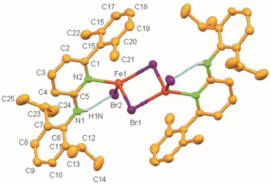 The molecular structure of 1 shows a centrosymmetric dinuclear mono(aminopyridine) iron bromide complex (Figure 2). Noteworthy is the rare η1-coordination of the aminopyridine ligand through pyridine nitrogen (d(N2–Fe1) = 2.093(3) Å) [30]. The coordination around each iron atom can be best described as distorted trigonal pyramidal and is completed by one N atom of the pyridine ring of the aminopyridine, and two bromide ligands. As expected, the Br-Fe bond for the bridging bromide ligand [Br1–Fe1 2.5260(8) Å] is longer than the terminal bromide ligand [Br2–Fe1 2.3985(8) Å] (Table 2). The long Fe⋯Fe distance of 3.439 Å rules out any possible metal-metal bonding interaction. It also exhibits intramolecular N–H⋯Br hydrogen bonds having an N⋯Br distance of 3.363 Å and an N–H⋯Br angle of 158.84°.