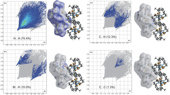 The Hirshfeld surfaces and 2D fingerprint plots were generated using Crystal Explorer 17.50 [29]. The X-ray single-crystal crystallographic information files were used as input files. The default setting used for Hirshfeld Surface/fingerprint generation in Crystal Explorer is as follows: property: none; resolution: High (standard). For fingerprint generation (di vs. de plot) we used: range: standard; filter: by elements and fingerprint filter options is both inside-outside elements including reciprocal contacts. The interactions with normalized contact distance in crystal structure shorter than the sum of the corresponding van der Waals radii of the atoms are highlighted by red spots and the longer contacts with the positive dnorm value are represented in blue colour.