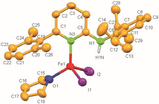 Synthesis of 2: ApH (358 mg, 1 mmol) was added to FeI2 (310 mg, 1 mmol) in THF (50 mL) at room temperature and the resulting brown-green solution was stirred overnight at 50°C. Solvent was evaporated and the material was re-dissolved in toluene (20 mL). Solution was filtered and the volume was reduced to ca. 10 mL to afford orange crystals at room temperature. Yield: 315 mg (42.5%). Elemental analyses for C29H38FeI2N2O: Calcd. C 47.05, H 5.17, N 3.78%; found C 46.55, H 5.05, N 3.57%.
