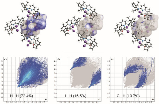 Hirshfeld surface analyses show that although the fingerprint profiles are still dominated by H···H contacts (72.4%), the contributions due to the intermolecular C-H···I hydrogen bonding are the maximum that have been observed (Figure 6 and Figure 7). The I⋯H/H⋯I interactions contribute 16.5%, and due to the intermolecular C-H···I hydrogen bonding, these contacts appear as sharp spike to the fingerprint profile. Other major contributions are due to the C-H···π interactions (10.7%) forming a pair of characteristic wings.