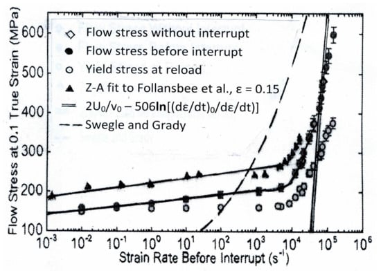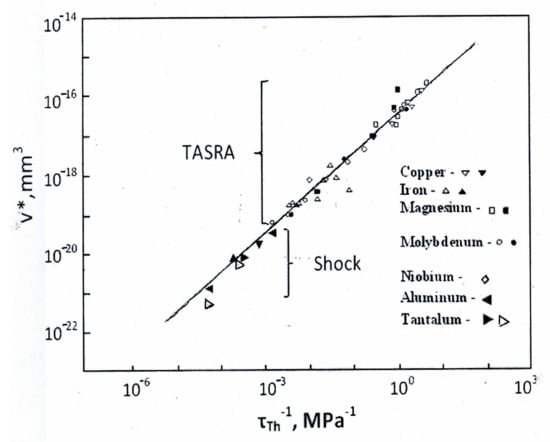 The constant W0 = 3.1 × 10−20 J shown in Figure 2, as originally obtained from a plot of various conventional test measurements, is extended to include determinations for a number of shock measurements. The open-triangle points were determined from model dislocation simulations reported for shocked tantalum by Ravelo, Germann, Guerrero, An and Holian [9]. Very importantly, the parameter W0 is seen also to be contained in the strain rate exponent factor described on a dislocation mechanics model basis in the text below Equation (1).