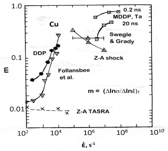 In Figure 4, the open-triangle, Follansbee et al. [1], and filled circle, DDP, calculations of Agnihroti and Van der Giessen [17] are compared with crossed Z-A TASRA [7] and open-triangle, Z-A shock [14], as well as with Swegle and Grady [5] copper measurements and added open-square, MDDP calculations made for tantalum crystals [20]. The values of m were computed in accordance with the Equation (2) Z-A shock relationship as