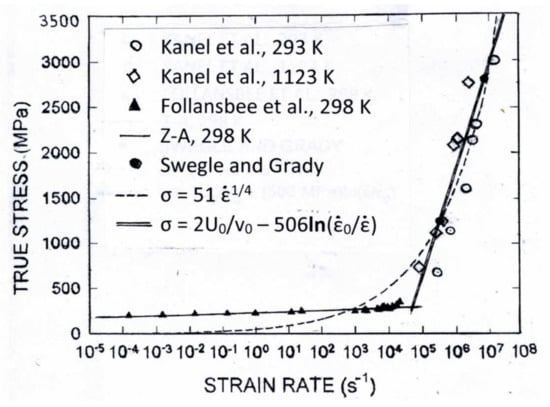 The strain rate enters into Equation (1) as (dε/dt)α1T, for which α1 = kB/W0, kB is Boltzmann’s constant, and W0 ≈ 3.1 × 10−20 J is a constant. On this basis, a dislocation mechanics-based strain rate exponent, m* = kBT/W0, is obtained in Equation (1) for the lower strain rate effect. As will be seen subsequently, it is important to distinguish between m* for the specific thermal activation-based strain rate sensitivity and the determination of an m parameter for the total logarithmic dependence of stress on the logarithm of strain rate. Also in Figure 1, the dashed curve applies for the extension to lower stresses of the σε = C(dε/dt) [1/4] relationship determined at higher shock pressures by Swegle and Grady [5]. By comparison, the nearly vertical linear stress dependence applies for a dislocation mechanics prediction from the TASRA relation subject to assumption of a constant lower value of the activation volume parameter, v* = v0, being reached as expressed in the modified TASRA relationship [6]: