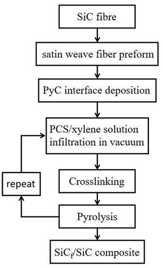 The chemical vapor infiltration (CVI) and precursor infiltration pyrolysis (PIP) procedures were adopted for the fabrication of SiCf/SiC composites with a pyrolytic carbon (PyC) interface, as shown in Figure 2.