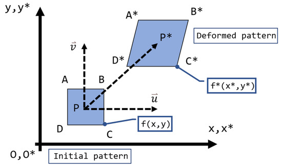 For the specimen surface, its 3D-coordinates reconstruction is possible from the point correspondence using triangulation. The principle of DIC is depicted in Figure 4. Derivation of the 3D displacement field is accomplished based on correlation between pre- and post-deformation images (corresponding separately to Figure 4’s initial and displaced geometries). Numerical differentiation is employed to transform the displacement field into a strain field.