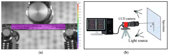 For the intra-experimental investigation into the strain layout and displacement properties of the SiCf/PyC/SiC composites, the 2D DIC strategy was employed to assess the strain fields and deformations on the sample surfaces. Spots were sprayed on the sample surfaces prior to the experiment, which was followed by the imaging system arrangement in front of the sample, where the optical axis of the camera was vertical to the spot surface (Figure 5).