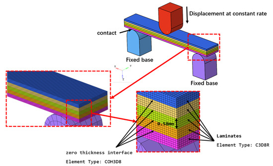 A three-dimensional FE model for a three-point bending test of five-harness five-layer satin weave SiCf/PyC/SiC plate composites was created (Figure 6). The ABAQUS FE-based qusai-static simulations were run under an explicit scheme for time integration, where the simulated workpiece material had a size of 39.9 × 6 × 2.9 mm. For the laminate meshing, eight-node solid elements (C3D8R) with reduced integration and hourglass control were adopted. Since the mechanical behavior of the interface is little influenced by its initial thickness, in this analysis the damage behavior of the composite interface was simulated with the zero-thickness COH3D8 cohesive elements. The optimal size of elements was 0.2 mm in the mesh research after considering a compromise between computational time and outcome accuracy.