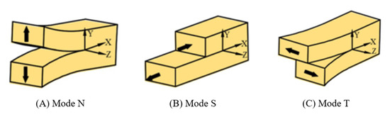 In the equations, denotes the MacAuley bracket, and ,, and stand for the inter-laminar fracture energies under modes N, S, and T, respectively, which represent cracks upon the separate impositions of opposite normal/tangential force-deformations on the upper and lower element surfaces, as illustrated in Figure 7. Furthermore, refer to the deformations in the normal, first shear, and second shear directions, respectively, and η, with a value of 1.45, represents the variable defined in the Benzeggagh–Kenane fracture criterion [35]. The mode mixing ratio β, on the other hand, can be formulated as: