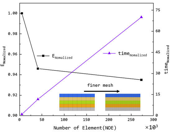 Mesh quality is a crucial factor for the forecasting accuracy. The mesh selection was accomplished through refinement analysis, where the models’ normalized Bending moduli of elasticity (divided by the effective model moduli with a 0.8 mm edge length of elements). The edge lengths of elements were set at 0.8, 0.3, and 0.15 mm herein. Limited variations (below 2%) are noted between the normalized moduli of varying meshes, as depicted in Figure 8. It is also distinctly visible from the local diagrams that the meshed models show variations with the size of element. Insignificant changes in the trends and outcomes from the foregoing analyses are expected with further refinements of the meshes, and the outcomes are well-consistent with each other. However, the computational duration prolongs significantly with the diminishing mesh size. The element size is finalized as 0.3 mm after trading off between the simulation accuracy and the computing expenditure.
