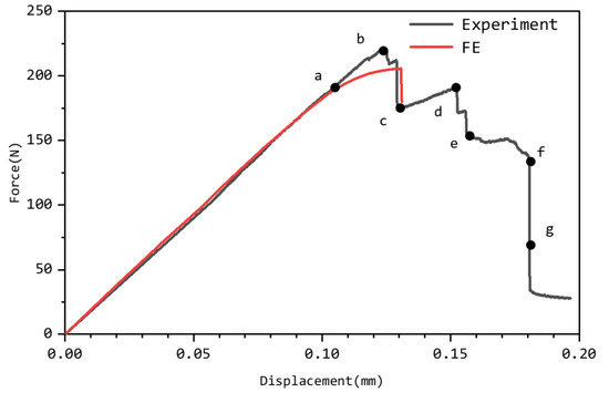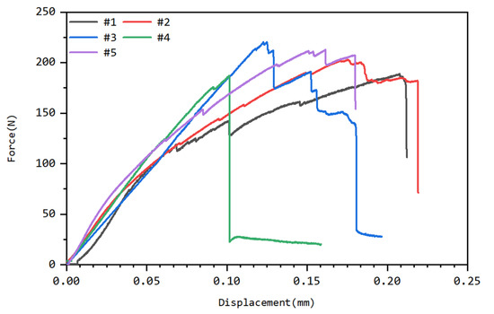 According to the experimental standard [39], a total of five samples were tested in this experiment, as shown in Figure 9, and the experimental results have good consistency. The force-displacement curve of sample #3 (bule one) is good, which is compared with the simulated curve, and its bending modulus is 48 GPa and bending strength is 246 MPa, respectively.