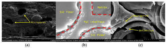 The morphology of SiCf/PyC/SiC composites on the microscopic scale is shown in Figure 11. During the pyrolysis process, due to the volume contraction of the precursor of the composite, a series of micropores are formed during the densification process, as shown in Figure 11a. As shown in Figure 11b, there is a distinct PyC interface between the fibers and the matrix with a thickness of about 4 μm, and no significant gap is found between the fibers and the matrix. During the load-bearing process of the composite material, microcracks initiated at the existing micropores in the composite material, then formed large cracks. Due to the laminar structure of the PyC interface, it has a certain deflection effect on the cracks, which expand in the interface, dissipate certain strain energy, and delay the fiber fracture, and the final result graph is shown in Figure 11c.