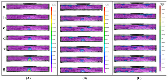 Evolutions of full-field strains under force of 180 N, 210 N, 165 N, 180 N, 145 N, 130 N, and 30 N (A) . (B) (C) .