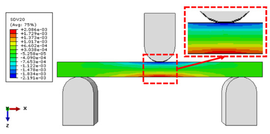 Figure 13 shows the specimen surface distribution of upon the specimen damage generation (SDV20 represents ), which is derived based on the FE simulations. For the specimen, its lower side is under tensile strain and the upper side is under compressive strain and contributes to the three-point bending applied to the specimen, the lower and upper sides of which are separately under tensile and compressive stresses primarily. Benefited from the mappings, the deformation of large areas of the material surface can be determined, which is consistent with the strain distribution measured by DIC method in Figure 12. The tensile and compressive strains on the surface of the specimen are focused in a limited range because of the PyC interface layer, indicating that a PyC interface with suitable stiffness can concentrate the material’s deformation in a short range. It is possible to get a satisfactory correlation between experimentally determined and anticipated failure location.