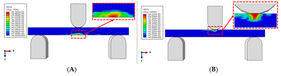 Figure 14 shows the damage distribution for the fiber tension and matrix compression on the sample (SDV1 represents tensile damage and SDV2 represents compression damage). Compared with Figure 12, it is found that Figure 12 and Figure 14 have a good consistency, the main damage mode of the composite on the lower side is tensile damage, and the upper side is mainly compressive damage attributed to the tensile strain mainly applied on the lower side of the specimen and the compressive strain mainly applied on the upper side, which can also be well-verified in the strain contours of each stage in Figure 12. As seen in the local graphs, both tensile and compression damage are significantly reduced when passing through different layups. This is because the PyC interface layer plays a certain hindering effect on the damage extension. The main mechanism is that the proper interfacial strength deflects the tiny cracks that will cause damage to the fibers, thus pushing back the process of forming main cracks and delaying the failure process of the material to some extent, and finally make the specimen exhibit pseudoplasticity.