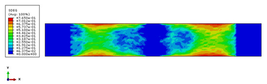 As shown in Figure 15 (SDEG represents interface damage), the interface damage initiates at the free edge of the specimen and attributed to the free edge effect, then the interfacial damage continues to expand until the interface delaminates. In the three-dimensional stress state, the junction of the composite laminate will show a certain free-edge effect, which is mainly manifested as the stress concentration phenomenon, making the delamination damage occur when the material is far below its service strength, leading to the early failure of the material, so the interface damage value at the free edge is the biggest. However, due to the existence of the PyC interface and the appropriate interface stiffness and strength of the interface, the tiny cracks will deflected, delaying the time of the formation of main cracks to the fibers, and increasing the overall damage tolerance of the specimens, so the satin weave SiCf/PyC/SiC composite plates shows a certain pseudoplastic characteristics. It can be noted that the delamination is an effective toughening mechanism of the laminated composite material whereby the fracture energy dissipates at the expenses of a translaminar cracking conducting to the failure.