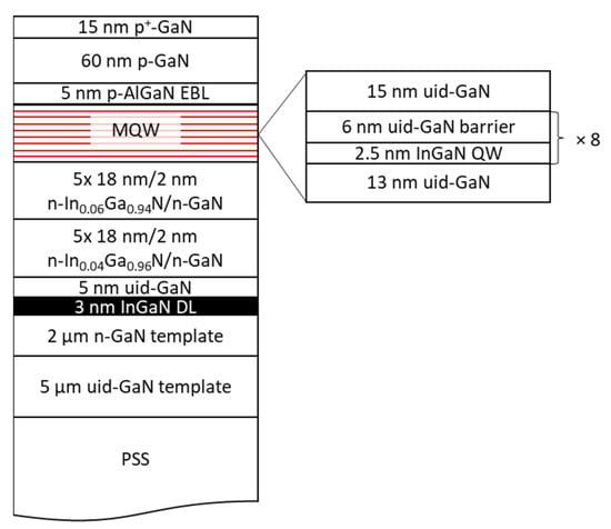 Similar growth of the LED epitaxial structure on SRTs has been reported previously [14,15]. The LED epitaxial structure on SRT is shown in Figure 1. The epitaxial structure was grown on patterned sapphire substrate with a 7.5 µm thick GaN template. First, a 3 nm InGaN decomposition layer was grown at 720 °C and this layer was capped with a 2.5 nm UID GaN at 720 °C, and 2.5 nm UID GaN at 825 °C. After that, two sets of InGaN superlattices (SLs) were grown. The two sets of SLs consisted of five periods of 18 nm n-In0.04Ga0.96N or n-In0.06Ga0.94N and 2 nm GaN at 930 °C and 920 °C, respectively. During the higher temperature growth of 930 °C, the decomposition layer thermally decomposed to form voids. The first set of SLs was referred to as the decomposition stop layer (DSL) and the second set of SLs served as the InGaN buffer. The developments and the corresponding relaxations of the decomposition layer, DSL, and SLs have been reported [14,15]. The active region was grown at 835 °C with eight periods of 2.5 nm InGaN/6 nm GaN quantum wells. Lastly, 5 nm of p-Al0.1Ga0.9N electron blocking layer (EBL), 60 nm p-GaN, and 15 nm p+-GaN were grown at 920 °C. The relatively thin p-Al0.1Ga0.9N EBL was attributed to the potential relaxation of the thicker AlGaN layer by growing on a higher lattice template. After the epitaxial growth, seven device sizes ranging from 5 × 5 to 100 × 100 µm2 were fabricated with 110 nm indium–tin oxide (ITO) contact and atomic layer deposition (ALD) for sidewall passivation; the details of the device fabrication and device designs have been reported in the literature [16,17]. On-wafer measurements were performed to obtain the electrical characteristics and packaging was executed to determine the optical and efficiency performances [18].