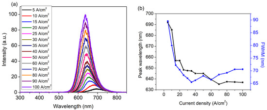 (a) Emission spectra from 5 to 100 A/cm2 from a 100 × 100 µm2 device and (b) the peak wavelength and FWHM with current densities from the 100 × 100 µm2 device.