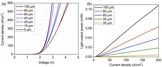 The InGaN red devices yielded exceptional electrical and optical performances, including low forward voltage and relatively high light output power (LOP) characteristics. Figure 3a shows the current density–voltage characteristics of the µLEDs. All the devices yielded a low forward voltage, showing voltage values between 2.00 V and 2.05 V at 20 A/cm2, which is the lowest voltage characteristic compared to other InGaN red emitters in the literature [9,15,19,28,29,30]. The low voltage could be attributed to the better hole injection via v-defects in the active region, where the v-defects could be generated from the buffer layer surface with deep pits [14,15,19]. As the current density increased, the voltage performance was dominated by the current spreading in the devices, where larger devices resulted in higher resistive characteristics due to greater p-GaN areas [31]. Figure 3b presents the LOP–current density characteristics of the red devices. Although the LOP remained lower compared to the conventional planar growth approaches, the performance was better when comparing to the other relaxation methods, suggesting that the SRT method is promising to realize biaxially relaxed templates for red InGaN µLEDs [19,24,29,30].