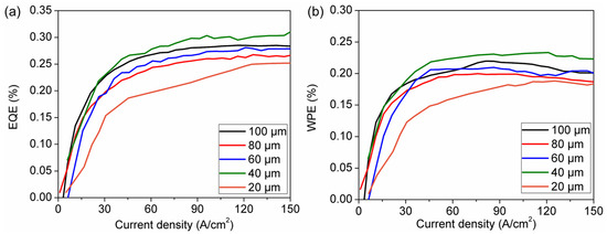 The EQE and WPE characteristics are shown in Figure 4. The peak EQE and WPE were 0.31% and 0.21%, respectively, and the efficiency performance was weakly dependent on the device dimensions. The EQE and WPE curves were low and did not show significant droop behavior, indicating the efficiency performance was constrained by the material quality in the active region [32]. Efficiency limitation was likely due to the trap-assisted Auger recombination (TAAR), since the EQE was low and the curves did not reach a peak value. The internal quantum efficiency could be limited by the ratio of TAAR and the radiative recombination if TAAR plays a significant role, resulting in low efficiency without droop [32,33]. In addition to the low efficiency, the devices did not show detectable light emission for applied current densities less than 5 A/cm2. This indicates that the device performance was hindered by the defects in the active region; the Shockley–Read–Hall non-radiative recombination reduced radiative recombination at low current densities and TAAR prohibited the optimal efficiency at high current densities [6,32]. Hence, further optimizations in the active region should be performed, such as incorporating an AlGaN capping layer in the active region [24].