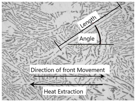 The length of the lamellae was measured to be equal to the Ferret diameter, which is the distance between two parallel tangential lines that force the object to be perpendicular to that direction. New image processing techniques facilitate the measurement and analysis of the Ferret diameter of each object, that is, for every eutectic Si lamella. The measured Ferret diameters were divided into ranges, and the percentage distribution of lamellae within a given range was investigated. In addition, angle measurements were performed; they describe the orientation between the axis of the eutectic Si lamella and the solidification direction (Figure 2).