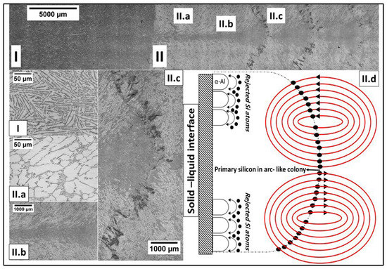 Micrographs of sample AlSi100 showing the microstructure of Al–12.6-wt%-Si alloy (I) macro- and micro-structures without magnetic stirring; (II) macro-structure under 100 mT magnetic stirring; (II.a) microstructure of primary Al at the edges of the sample; (II.b) Christmas-tree-like (CTL) segregation pattern; (II.c) primary Si arc-like segregation; (II.d) formation mechanism of the primary arc-like segregation pattern.