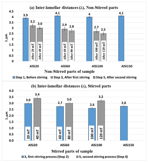 Inter-lamellar distances were measured using the specific perimeter method. In general, the stirring process reduces the inter-lamellar distances in the non-stirred parts. Figure 4a shows the measurement results of the non-stirred parts of the samples in Step 1 (before stirring), Step 3 (after the first stirring), and Step 5 (after the second stirring) of solidification. The following conclusions are drawn: (i) If the molten liquid is stirred many times in a row, the inter-lamellar distance decreases after each stirring process. (ii) The intensity of magnetic induction has a pronounced effect on the inter-lamellar distances after stirring; in the AlSi20 sample, the inter-lamellar distances after 20 and 40 mT were 3.2 and 3.0 µm, respectively. The same trend was observed when a higher magnetic field intensity was applied.