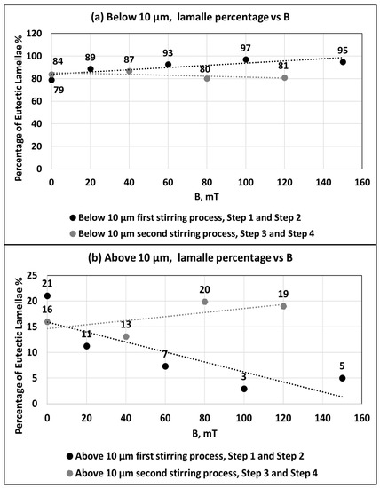 Figure 6 shows the distinct effect of the RMF on Si lamellar size refinement. The fine Si range (<10 μm) had the highest percentage of stirred and non-stirred parts. However, the percentages of fine Si plates were higher in the case of RMF, especially during the first stirring process (Figure 6a). On average, 78% of the Si lamellae had a length less than 10 μm in the non-stirred parts at step 1. This percentage increased with stirring intensity. When applying a 20 mT magnetic intensity, the percentage of the smallest lamellae increased to 89%. Applying 60 mT magnetic induction increased the rate to 93%. The increment was also observed when 100 and 150 mT magnetic induction were applied to stir the molten liquid, in which the measured percentages were 97% and 95%, respectively.