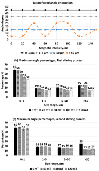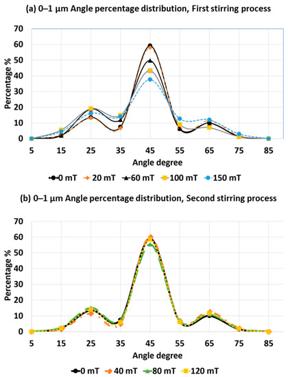 Figure 7b shows the angle distribution curve for the size range 0–1 µm during Steps 3 and 4 of the solidification experiments. In Step 3, the samples were solidified without instant stirring, but the molten liquid was stirred previously during Step 2. The angle distribution curve of Step 3 is identical to that of Step 1 (series 0 mT in Figure 7a), signifying that the angle percentages remained unchanged before and after the stirring process. This inference is valid even during the second stirring process in Step 4. The angle distribution curves for the parts, which were stirred twice, show a similarity in values (series 40, 80, and 120 mT).
