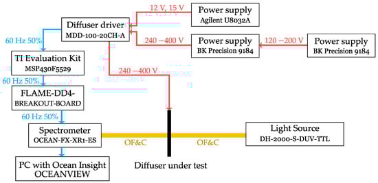 Electro-optical response study was performed by 3-laser beam system (wavelengths: 635 nm, 532 nm, 450 nm) or, if specifically noted, using white LED. The light transmitted through the cell was measured by a photodiode and a computer-controlled lock-in amplifier. The photodiode detector FDS100 (ThorLabs, Newton, NJ, USA.) was placed at a distance of 162 mm from the cell, the corresponding collection angle was 9.18°. Keysight Infinii Vision 2000 X series oscilloscope or Ocean Optics Flame T UV-VIS spectrometer was used for data acquisition. Spectrometer was synchronized to the driver according to the experimental setup, see Figure 2.