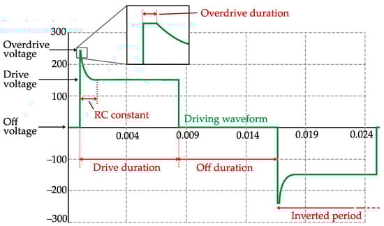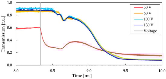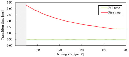 Indeed, increasing the driving voltage reduces the time of transition from the FC state to H state (see Figure 5); however, it also increases risk that the LC cell will undergo electrical breakdown, especially when the threshold voltage is already high. The field value at which the dielectric breakdown occurs depends on the liquid crystal material and the overall quality of the given cell. Typically, dielectric breakdown has been observed to occur at applied electric field to the cell of about 10 to 25 V/μm []. Thus, all experiments described are performed at a driving voltage and an overdrive voltage of unless otherwise noted (see top half of Figure 3). With suitable dielectric-breakdown prevention measures, driving voltage can be increased a few times and rise time accelerated to 600 μs.