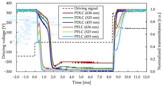For typical long-pitch cholesteric LC crystal cells, the switching behavior depends on the driving voltage. Increasing the voltage, the rise time shortens but the fall time becomes longer. In contrast, for short-pitch PFLC cells, the fall time is virtually independent of the driving voltage, see Figure 5.