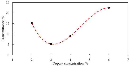 Change in direct optical light transmission of a PFLC light diffuser element in relation to dopant concentration. Utilized light source: white LED.