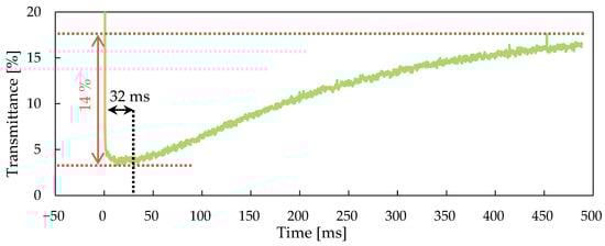 Change in direct optical light transmission of the PFLC light diffuser element over time after the onset of external electric field-off condition. Utilized light source: white LED.