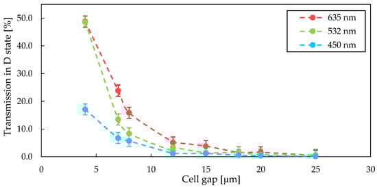 Light transmission in the diffuse (D) state, depending on cell gap and wavelength.