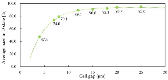 A related trend between the cell gap and haze values within the diffuse state can be seen in Figure 9. With a growing cell gap, haze values also increase. The saturation of haze starts at around 12 µm cell gap and a further increase in haze is a slow asymptote towards 95.77%.