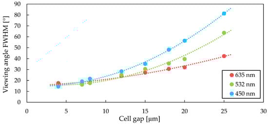 Diffuse state light transmission and haze properties have strong correlation with viewing angle. Overall, increasing the cell gap also increases the viewing angle for all three wavelengths, see Figure 9 and Figure 10 (for diffuser elements with cell gap of 12 µm to 25 µm). The red (635 nm) wavelength has the narrowest viewing angle, while the blue (450 nm) has the widest viewing angle.
