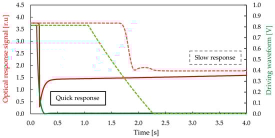 In the case of PFLCs, if the electric field is decreased slowly, for example, by discharging conserved electric energy through a switched-off driver unit or added resistor, the switching speed is slower and the maximum scattering state is never observed, so transmission is only reduced to 40%, see Figure 11.
