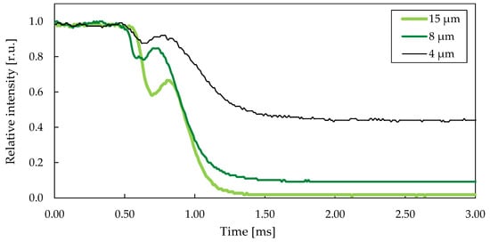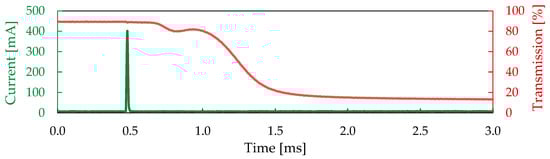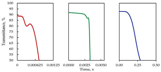 Different types of surfaces for LC alignment were evaluated, see Table 1. The intensity and timescale of the transient peak were observed to be similar for all surface conditions for 7 µm 67 × 60 mm cells. However, from the surface role studies, we can conclude that if any notable reverse backflow was present, it was countered by the reverse pretilt (antiparallel) surface condition, and it is not the cause of the transient peak M, as no change in its intensity or position on the falling edge was detected.