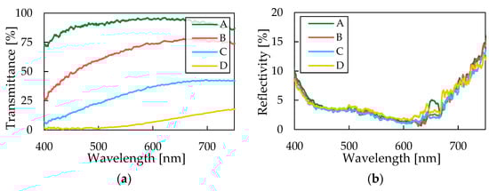 Approximately 0.2 ms are lost during the transient transmission peak, M state. Contrary to the TP state for PDLC systems, no selective reflection is observed. Transmission and reflection spectra of a 12 µm cell gap diffuser were measured with Ocean Optics Flame-T spectrometer, using an integrating sphere at several positions: A—before M state, B—at the maximum of M state, C—after the M state and D—at maximal diffuse (FC) state; see Figure 14.