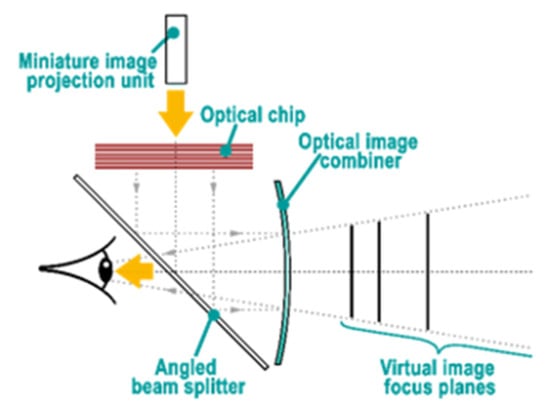For multi-focal applications, such as volumetric image display in virtual reality (VR) and augmented reality (AR) headsets, multiple LC cells or optical diffuser elements must be stacked together [] to create an integrated optical chip (a discretized projection volume), see Figure 17.